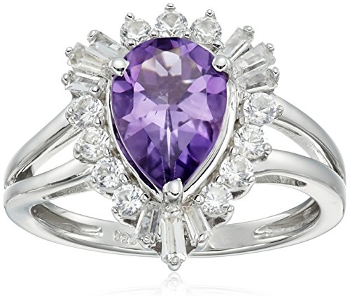 -. Title : Sterling Silver Pear Shape Amethyst with Round Baguette Created White Sapphire Ring, Size 7