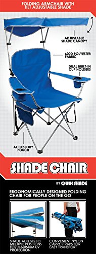 ReleaseDate : 2011-12-02 Studio : BY QuikShade Publisher : BY QuikShade Binding : Sports Product Description Now you can get the best seat in the great outdoors by taking the shade with you! The Quik Shade Adjustable Canopy Folding Camp Chair unfolds with no assembly required and then folds easily back up into a compact carry bag with a shoulder strap. Just open the chair and the shade clicks into position with one easy motion, held in place by the included tension rod. The patented design allows the sun shade to raise, lower, and tilt to block the sun from any angle. The moisture and stain resistant fabric is durable and can easily be cleaned. The chair features superior comfort with a 24-inch oversized seat and dual cup holders for staying hydrated on those hot summer days outside. When assembled, chair measures 30"L x 34"W x 49"H and 36 inches when folded, seat is 18 inches from ground, and weighs only 9 pounds yet easily supports up to 225 pounds! With the Quik Shade Adjustable Canopy Folding Camp Chair, take the shade with you, exactly where you want it. Includes 1 folding chair and 1 carry bag. 0