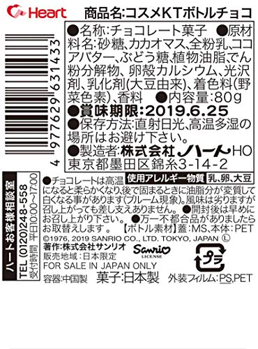 原材料:砂糖、カカオマス、全粉乳、ココアバター、ぶどう糖、植物油脂、でん粉分解物、卵殻カルシウム、光沢剤、乳化剤(大豆由来)、着色料(野菜色素)、香料
