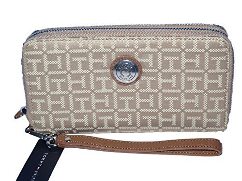 TOMMY HILFIGER TAN BEIGE SIGNATURE LARGE DOUBLE ZIP WRISTLET PHONE WALLET