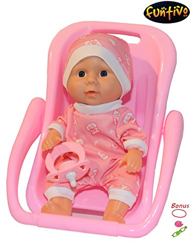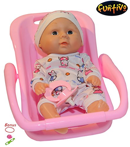 FUNTIVO brand of dolls are designed with a safe and healthy material for your kid's safety. With beautiful realistic eyes, flannel pajamas and night cap, a baby carrier and a pacifier, these are the perfect baby dolls for play dates and road trips. It is a perfect and great gift for your daughter, or grandchildren who love dolls. A great addition to their doll collection. This doll has a plastic body encourages holding, nurturing and special care so your kid can develop social skills. Hand washable body and easily removable outfit so you can make your doll look brand new. Comes with a free gifted extra 3 products - 1 JUMPING POPPERS, 1 STRETCHY FROG SLINGSHOT, and 1 NEON JELLY BRACELET. Your perfect choice for your kids enjoyment!