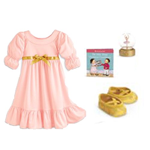 -A pale-pink nightie featuring three-quarter sleeves with double puffs, an empire waist trimmed with a golden ribbon and bow, and a pretty ruffle at the hem