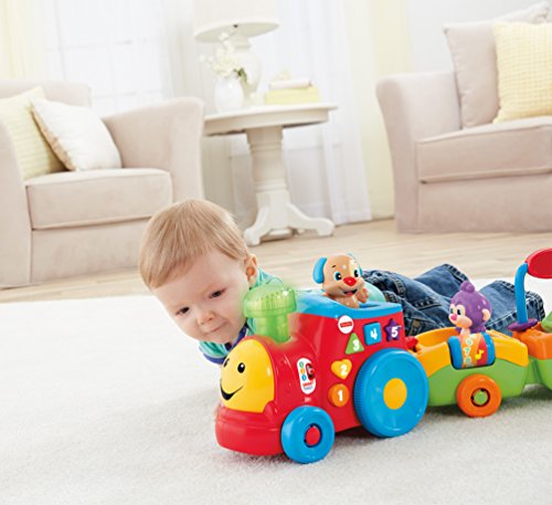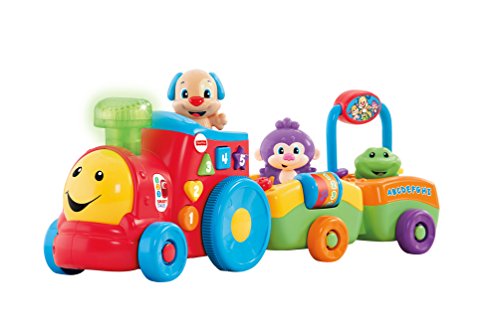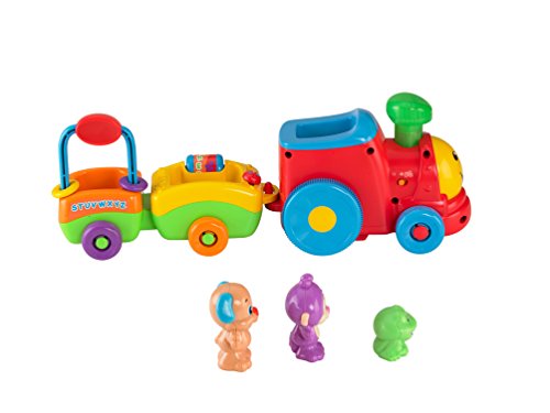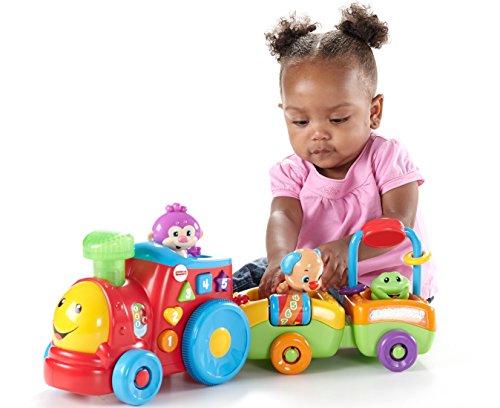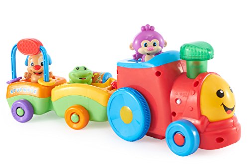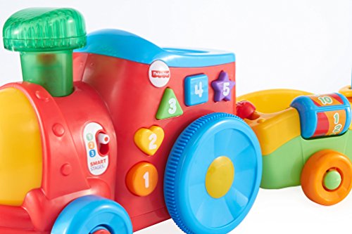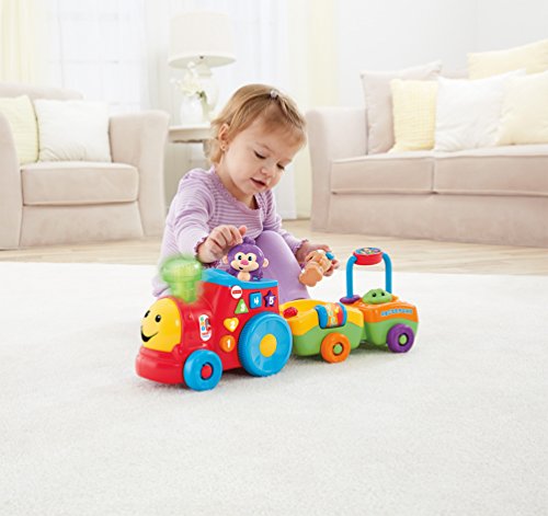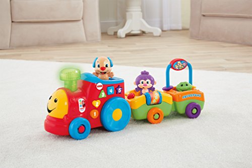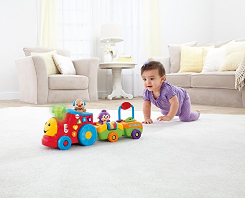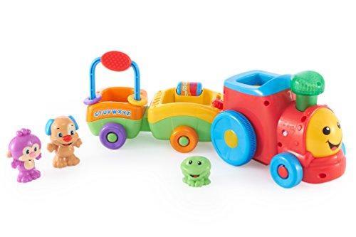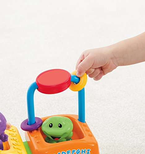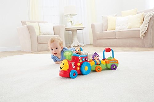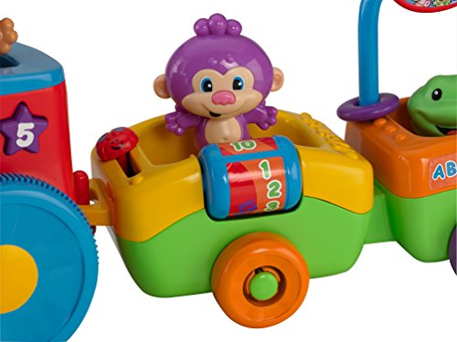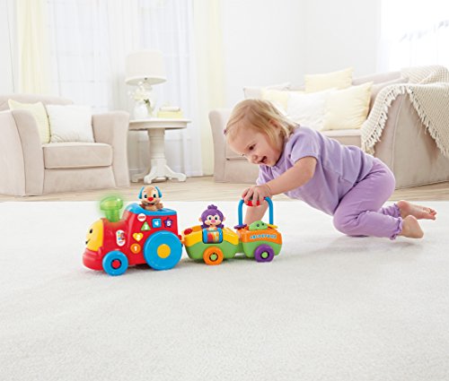 Songs, phrases and sounds introduce letters, numbers, colors, shapes and more. Busy activities like a slider ladybug, ABC spinner, number roller and clacker beads all foster eye-hand coordination and fine motor skills. Baby can press the smokestack for motorized action and lights, introducing cause and effect. And fun characters and questions prompt imagination as baby plays along.