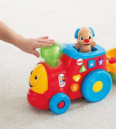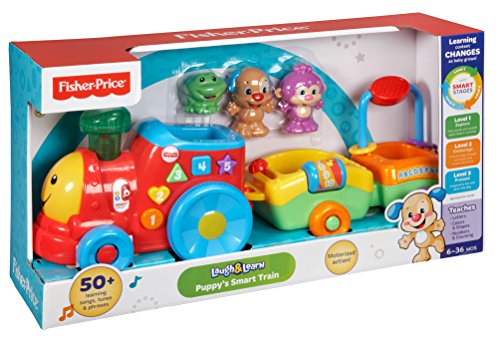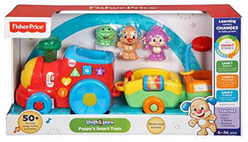 Level 1 ? Explore ? 6M : Spark curiosity with busy activations, like pressing shape buttons or the smokestack for phrases and motorized action. Hear simple words like, “Heart; yellow; two.” Level 2 ? Encourage ? 12M : This level expands on the introduction of letters, colors and more by encouraging baby to get involved. Hear prompts like, “Let’s sing the ABCs!” Level 3 ? Pretend ? 18M : All aboard with Puppy, Monkey and Froggy! Older babies can engage in imaginative play inside Puppy’s world. Hear phrases like, "The train loves to go choo-choo! Can you?"
