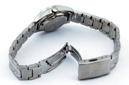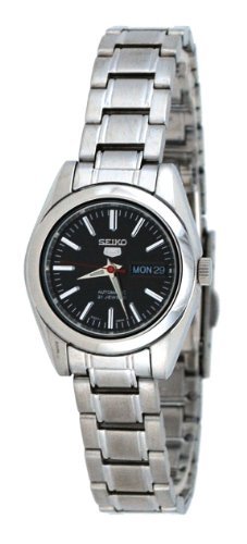 Stainless steel case with a stainless steel bracelet. Fixed stainless steel bezel. Black dial with luminous silver-tone hands and index hour markers. Dial Type: Analog. Luminescent hands. Day of the week and date display at the 3 o' clock position. Automatic movement with a 24 hour power reserve. Scratch resistant Hardlex crystal. Pull / push crown. Solid case back. Case diameter: 25 mm. Case thickness: 10 mm. Round case shape. Band width: 12 mm. Band length: 7 inches. Fold over clasp. Water resistant at 30 meters / 100 feet. Functions: date, day, hour, minute, second. Additional Info: 21 jewels. Dress watch style. Seiko 5 Automatic Black Dial Stainless Steel Ladies Watch SYMK17.Feature