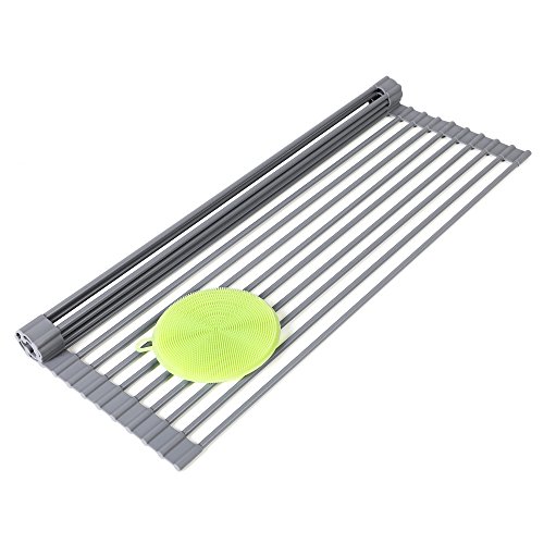 SONGMICS Roll-Up Dish Drainer Rack Bonus Dish Scrubber Over the Sink Multipurpose Drying Rack Kitchen Countertop 20 1/2”L x 13 3/8”W Gray UKDR01G