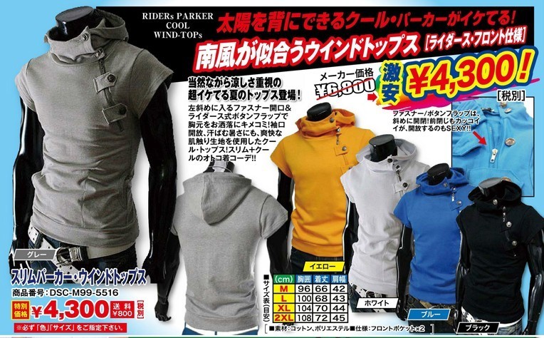 通常6800円(税別)の処、特別価格4300円にて!ライダーススフロント仕様ク―ルパーカー!南風が似合うウインドトップス!5色x4サイズ!太陽を背にできるクール・パーカーがイケてる! 南風が似合うウインドトップス![ライダース・フロント仕様!] 当然ながら涼しさ重視の超イケてる夏のトップス登場! 爽快な肌触り生地のクール・トップス! 左斜めに入るファスナー開口&ボタンフラップで胸元をお洒落にキメコミ! 袖口解放、汗ばむ暑さにも、爽快な肌触り生地を使用したクール・トップス! スリム+クールのオトコ着コーデ!! ファスナー/ボタンフリップは斜めに開閉!前閉じもカッコイイが、解放するのもセクシー!
