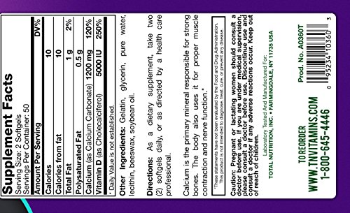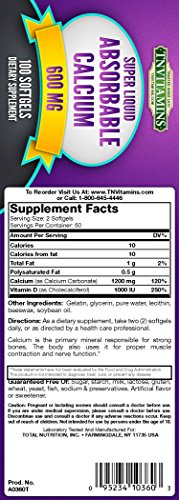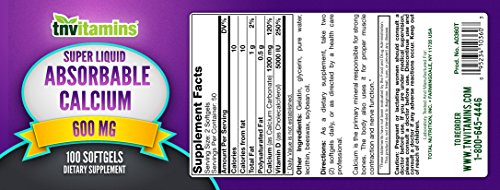 -. Binding : Health and Beauty -. Brand : TNVitamins -. EAN : 0095234103603 -. Feature : A Full 1200 Mg Calcium Per 2 Softgels Serving - Superior Calcium Source - Easy To Swallow -. IsAdultProduct : 0 -. Label : TNVitamins -. LegalDisclaimer : Information provided is intended for general knowledge. It is not a substitute for professional medical advice or treatment for specific medical conditions. Always seek the advice of your physician or other qualified health care provider with questions you may have. Any information provided is not intended to diagnose, treat, cure or prevent any disease. These statements have not been evaluated by The USFDA. These products are not intended to diagnose, treat, cure or prevent any disease. -. Manufacturer : TNVitamins -. MPN : A0360 -. PackageQuantity : 1 -. PartNumber : A0360 -. ProductGroup : Health and Beauty -. ProductTypeName : HEALTH_PERSONAL_CARE -. Publisher : TNVitamins -. Size : 100 Softgels -. Studio : TNVitamins -. Title : Absorbable CALCIUM 600 Mg Plus Vitamin D 500 IU - 100 Softgels -. UPC : 095234103603