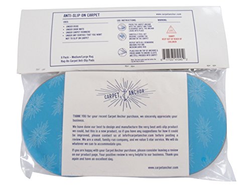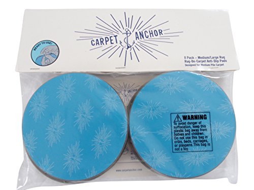 -. Feature : RUG-ON-CARPET ANTI-SLIP PADS. KEEP RUGS FROM SHIFTING ON TOP OF CARPET. DESIGNED FOR MEDIUM PILE CARPET. Place the pads in the carpet with the hooked side facing down and give each disc a 1/4 turn clockwise to anchor it into the carpet. Then remove the adhesive backing and place the rug on top of the anchored discs. / 8 PACK - Intended to limit shifting of small, medium or large sized rug on top of MEDIUM pile carpet. Perfect for small, medium or large sized area rugs, hall runners, kitchen mats, door mats. Keeps rugs from moving on top of carpet. Includes 8 X (5" Diameter) durable, plastic, barbed pads. Come with adhesive backing to adhere the pads to the underside of the rug - no glue required. / Carpet Anchor Pads are designed for use on MEDIUM PILE CARPETS. *Not ideal for use on berber, commercial grade low pile carpets, or plush high pile carpets. Carpet Anchor Pads are also available in a 4 Pack (for a door mat) or 12 Pack (multiple rugs). / PLEASE CLICK ON BY CARPET ANCHOR ABOVE TO SEE ALL OF OUR CARPET AND RUG ANTI-SLIP PRODUCTS.