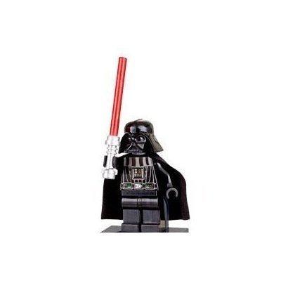 Originally from Star Wars lego set #6211 Imperial Star Destroyer, these three 1-inch lego mini figures are the best combination. The Darth Vader minifigure has black legs, black arms, and black hands. His torso has a special design showcasing a control panel with red and blue buttons on his torso, with gray outlines around it. He has a cape, and a gray scarred minifigure head.