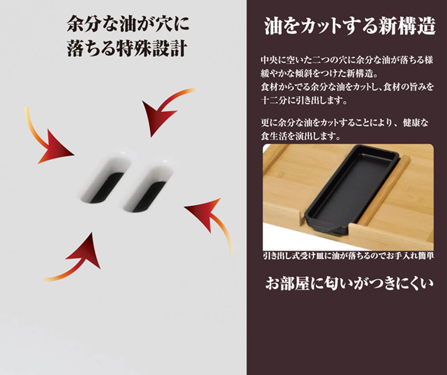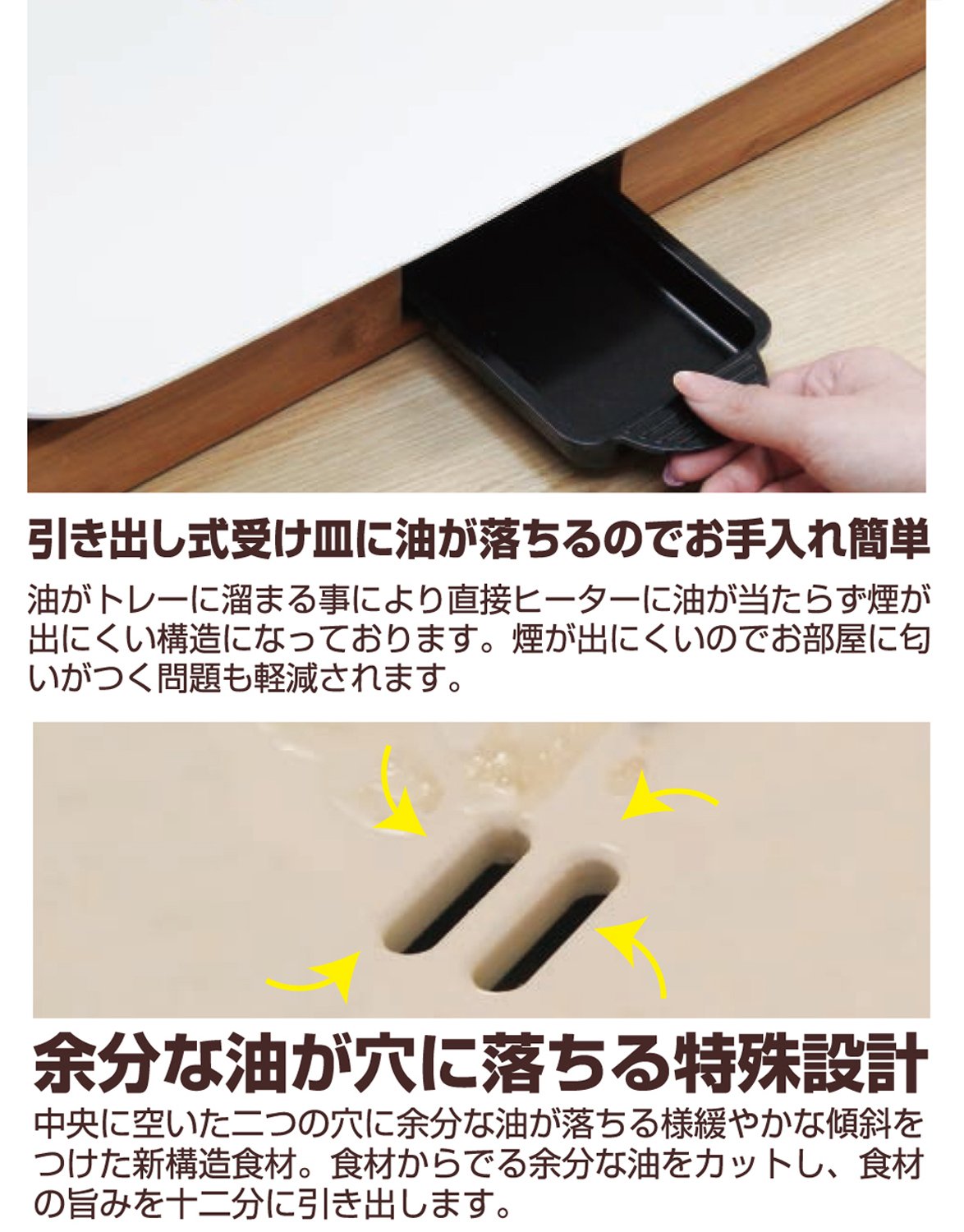 Oil stays in the tray, so oil does not hit directly on the heater and it is structured to make it difficult for smoke to come out