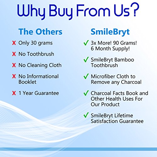Studio : SmileBryt Publisher : SmileBryt Binding : Misc. Product Description Introducing SmileBryt's new Activated Charcoal Teeth Whitening formula. Everyone is talking about Activated Charcoal Teeth Whitening powder as the newest and most effective way to whiten your teeth without creating sensitive teeth. SmileBryt was introduced into the market and was designed to whiten your teeth fast while giving you the peace of mind that you are using a safe organic product. Have you been wanting that bright white smile? Have you tried the other products? Now it's time to get those Pearly Whites using the best product on the market. SmileBryt's Activated Charcoal Teeth Whitening Formula will brighten your smile fast! Less than a week! You will be amazed at how quickly our formula gives you results. So how do you use it? Easy, brush your teeth for 2 minutes up to 2 times a day with the included SmileBryt Toothbrush. Dip it into the powder, be careful as you don't want it to spill. knock off the excess and start brushing. It will make your mouth black as can be but it just means it working. Brush for 2 minutes and then rinse. We recommend brushing with regular toothpaste after just to make sure all the charcoal is out of your mouth giving you that clean smile.Use the microfiber cloth to clean up. Now you have the process down just watch your smile transform. See the difference within 1 week, we promise you will be amazed The powder is fine and silky not harsh and gritty Derived from the highest-quality coconut sources, our activated charcoal is safe to use on your teeth and easy on your gums. Your mouth will not only look bright and white but you breath will also be fresh and clean This formula is natural and organic. On top of the that we give you a 6 month supply! You simply can't afford to not get your hands on a SmileBryt! Happy brushing! 0