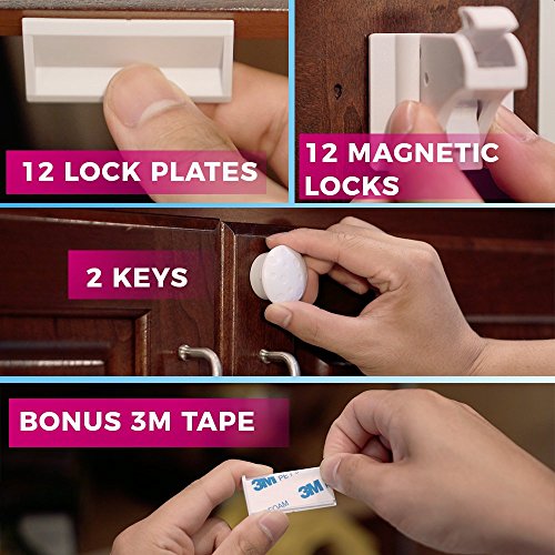 This top notch set includes 12 magnetic child safety cabinet locks and 2 heavy duty magnetic keys(magnetic strength up to 1.75 Inches thickness) that can be used for easily unlocking them.