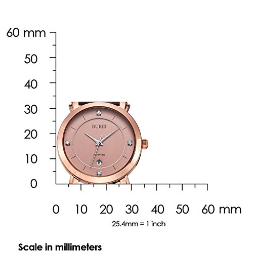 -. Feature : Classic Swiss-inspired women's watch design, with ultra-precise Japanese quartz movement; sleek and professional style is replete with feminine sophistication. / QUALITY - Genuine calfskin strap, hypoallergenic; sapphire lens; stainless steel case, corrosion- and scratch-resistant; water-resistant to 30m (99ft). / GUARANTEE - 30 days money back guarantee for any reason, 12 mo. replacement or full refund for quality issues, and 24 mo. maintenance for quality issues. / ABOUT BUREI - We design watches and sell them direct from our factory to you, without the heavy price tag, beating competitor's prices daily. / Case Diameter: 33mm, Weight: 33.6g, Band Length: 187 mm, Band Width:14 mm; includes gift bag, additional colors and styles available from BUREI.