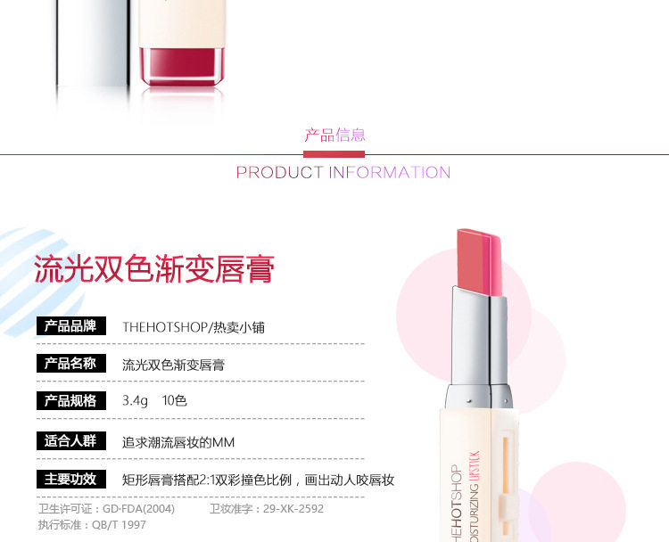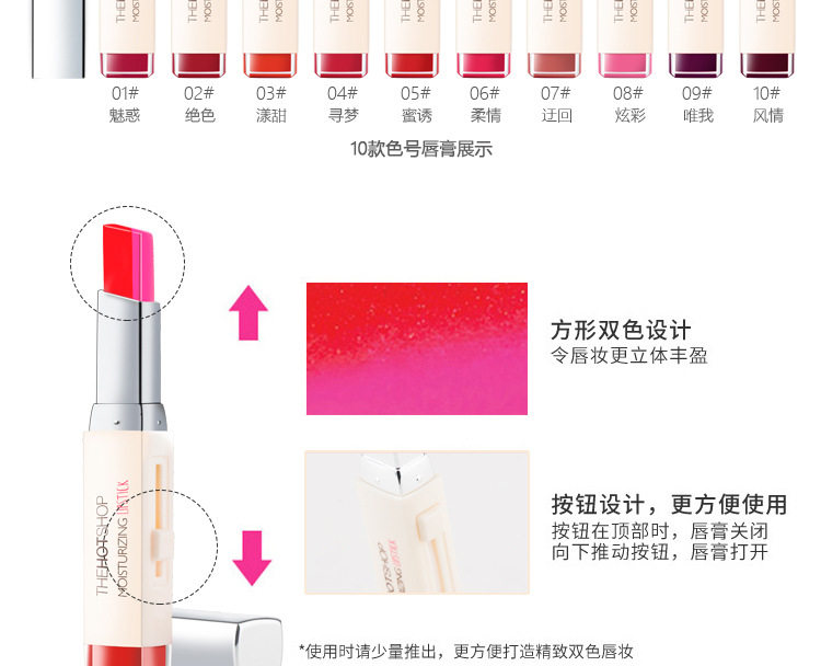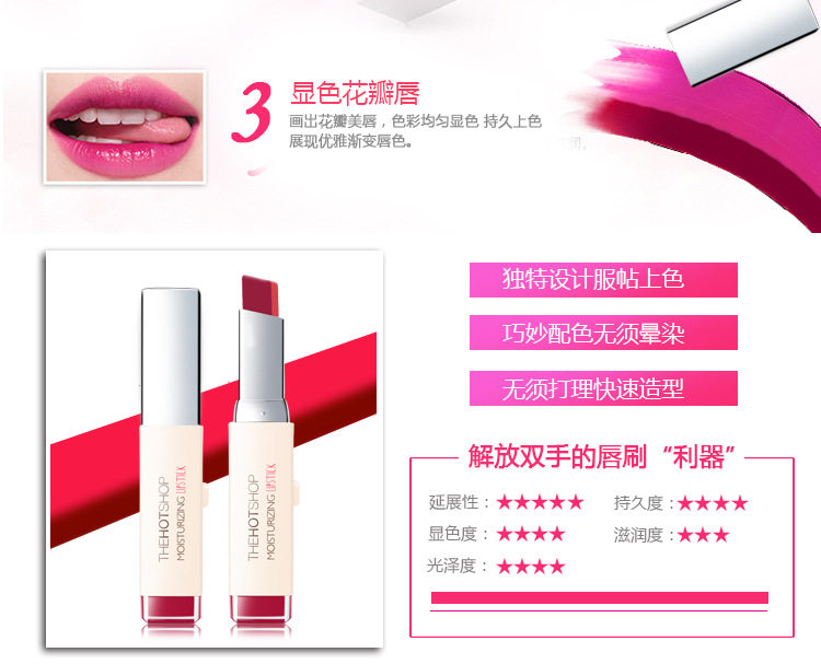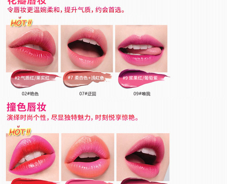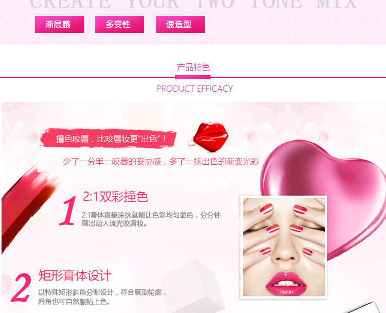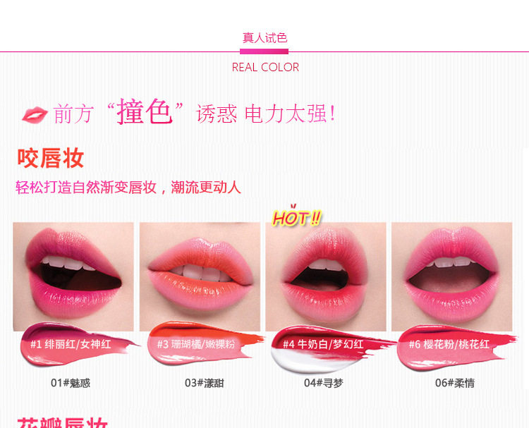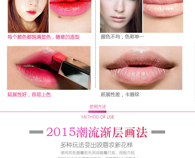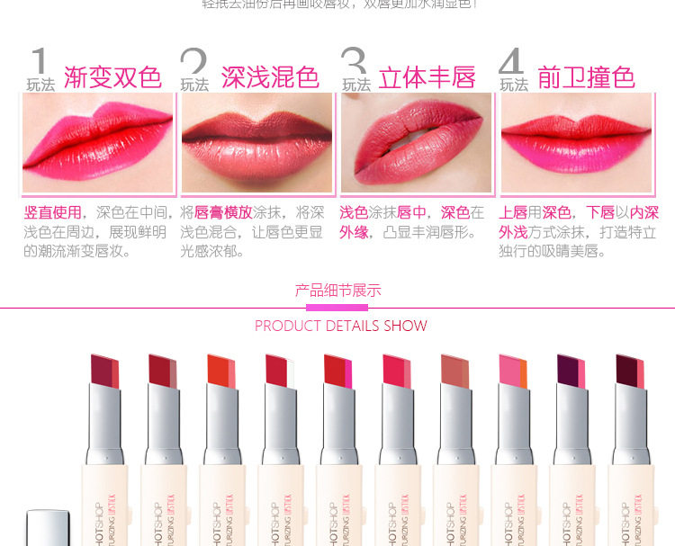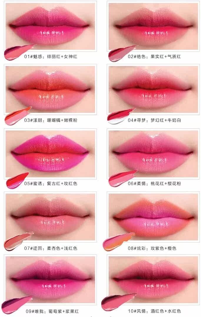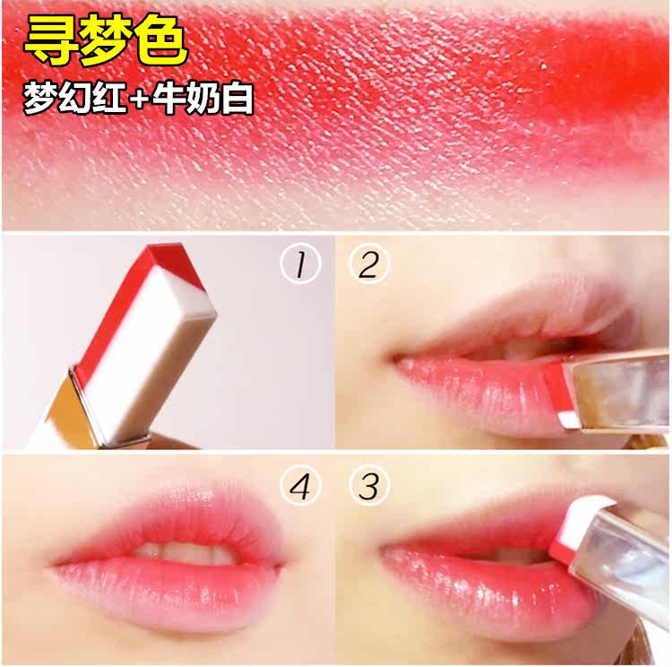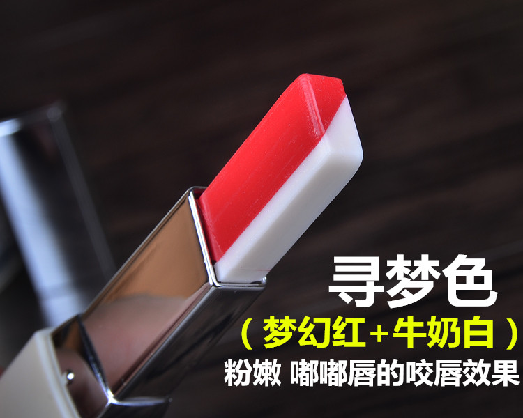 白色是打底渐变色,抹上后不是纯白色的,是会中和双色中的红色,一个方向涂摸会形成一种过渡渐变咬唇妆色