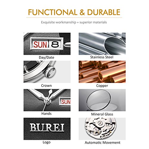 -. Feature : 1. Japanese automatic movement, day date calendar analog display / 2. Black brass dial, protective mineral glass / 3. Round silver stainless steel case, water resistant 5 ATM / 4. Stainless steel bracelet with clasp / 5. WARRANTY: 30 Days money back guarantee; Friendly customer service within 12 hours; PACKAGE: 1x BUREI Watch, 1x Branded BUREI box, 1x Gift Bag, 1x Warranty Card, 1x User Manual, 1x Link Remover.