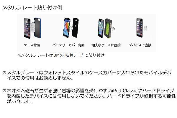 | クリップで固定するタイプなので取り付けや移動が簡単です。付属のメタルプレートをデバイスに直接貼り付けるか、ケースの内側や外側に貼り付けて使用します。横置き・縦置きに合わせて、デバイスを自由なアングルで取り付けることが可能です。 |