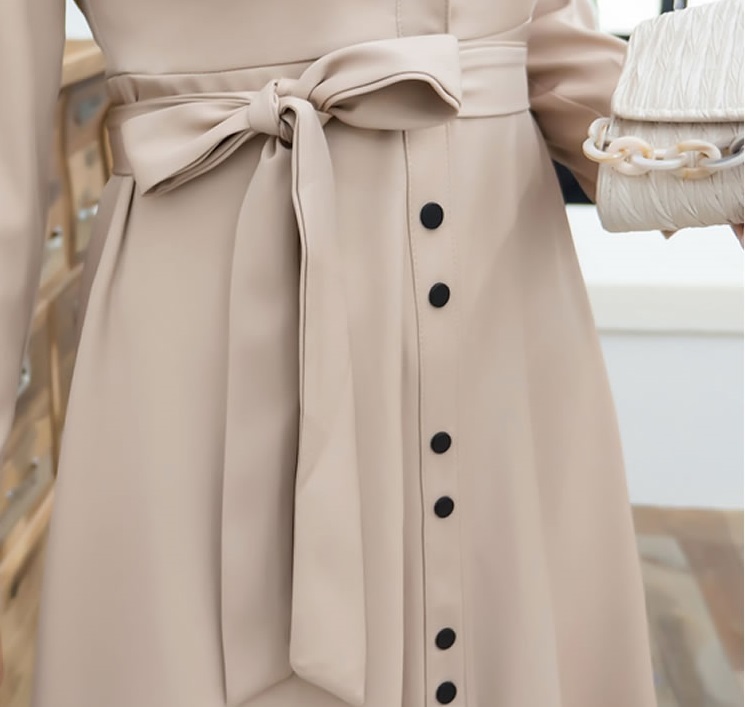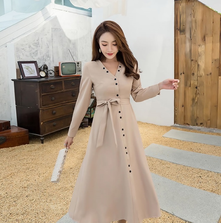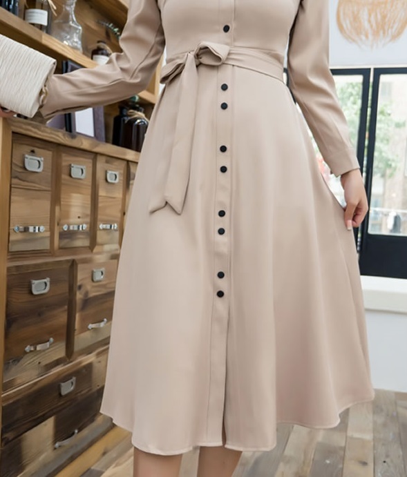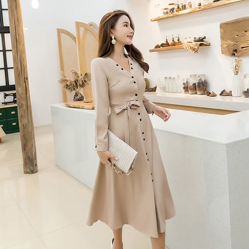 やや深めのVネックと上品なミモレ丈で、オンオフ問わずにご愛用頂ける1枚です◎