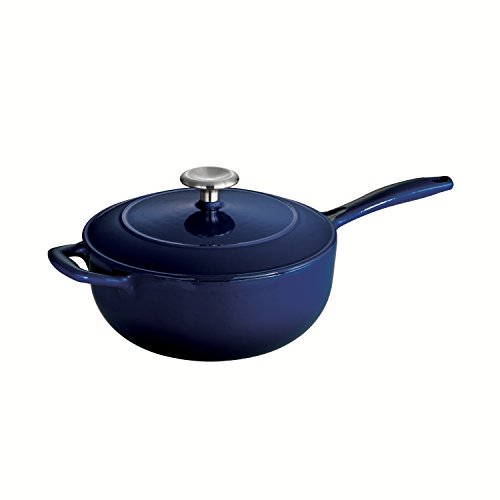The enameled cast-Iron 3 Qt covered saucier pan is part of Tramontina's Gourmet collection of premium products engineered and manufactured with the finest design, materials and workmanship, outperforming similar products within the market and delivering the best quality and value to the cooking professional and enthusiast alike. Prized by cooks for heat retention and even cooking, this enameled cast-iron 3 Qt covered saucier pan comes in a vibrant, gradated porcelain enamel exterior finish offering an elegant kitchen to table serving option. The self-basting condensation ridges on lid uniformly collect and direct vapors onto food, producing moist and savory dishes making the saucier a perfect vessel for slow heating to tenderize meats, poultry and vegetables or evenly reducing sauces. The heavy-gauge cast-iron covered sauce pan cooking surface is coated with off-white, smooth and easy-to-clean PFOA- and PTFE-free porcelain enamel and the sturdy side handles make handling a filled pan more manageable. Hand-wash only, compatible with all cooktops and oven-safe to 450 F. This product is assembled and packaged in USA and offered under a lifetime warranty.Feature