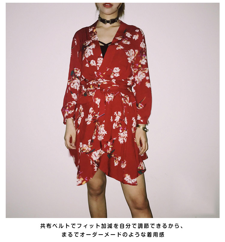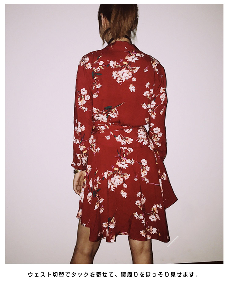 | 表情豊かな花柄ラップワンピース!イレギュラー裾は美脚効果抜群で、フェミニンな印象◎共布ベルトでフィット加減を自分で調節できるから、まるでオーダーメードのような着用感ウェスト切替でタックを寄せて、腰周りをほっそり見せます。 | |