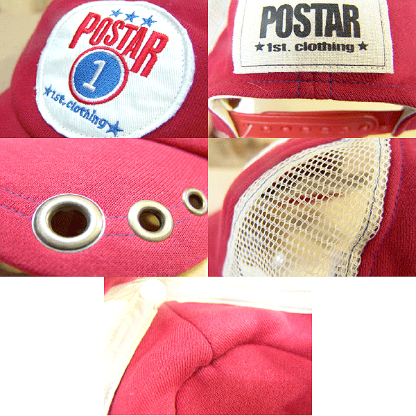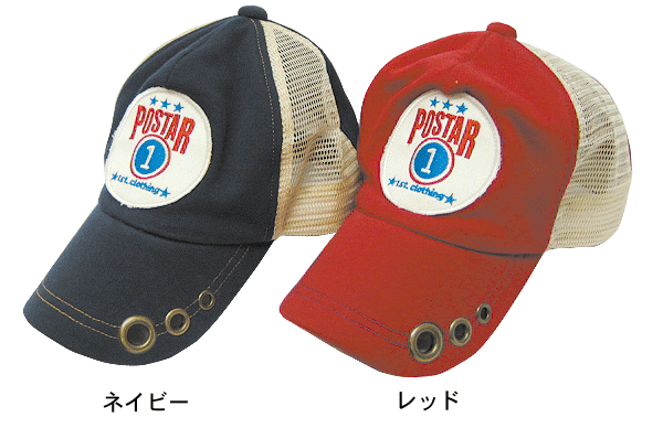 メッシュキャップ。 全面部分のアップリケはポスターの定番。