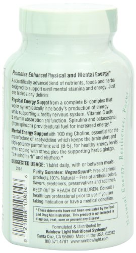 -. Binding : Health and Beauty -. Brand : Rainbow Light -. Department : Health and Beauty>Health and Wellness -. EAN : 0021888108046 -. Feature : For Physical & Mental Energy / Eleuthero & Ginkgo, High Potency / One Tablet -. IsAdultProduct : 0 -. IsAutographed : 0 -. IsMemorabilia : 0 -. Label : Rainbow Light -. LegalDisclaimer : * These statements have not been evaluated by the Food and Drug Administration. This product is not intended to diagnose, treat, cure or prevent any disease. ** Always refer to the manufacturer's label on the product for description, recommended dose and precautions. -. Manufacturer : Rainbow Light -. Model : 10804 -. MPN : 10804 -. NumberOfItems : 1 -. PackageQuantity : 1 -. PartNumber : 10804 -. ProductGroup : Health and Beauty -. ProductTypeName : HEALTH_PERSONAL_CARE -. Publisher : Rainbow Light -. ReleaseDate : 2006-01-27 -. Size : 90 -. Studio : Rainbow Light -. Title : Rainbow Light Energy B-Complex, Food Based, Tablets, 90 tablets -. UPC : 021888108046