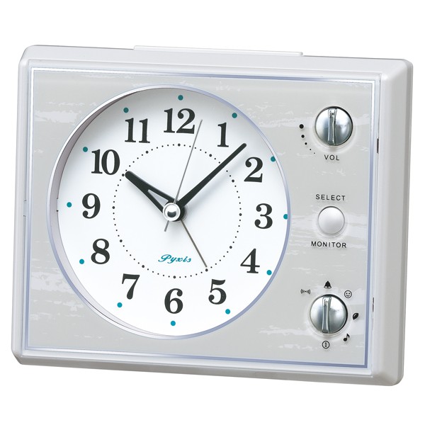 単3(アルカリ)×3、電子音/ベル音/擬音/メロディアラーム(選択式)、アラームオートストップ:約5分間、スヌーズ、音量調節、ライト、アラームモニター、スイープ秒針、カラー:ホワイト
