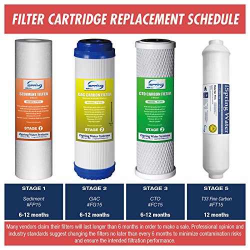 1x Post Carbon Inline Filter (5th Stage, #FT15): Polishes the water from the tank before it is delivered to the faucet. Replace approximately every 12 months.