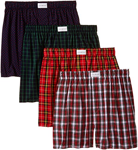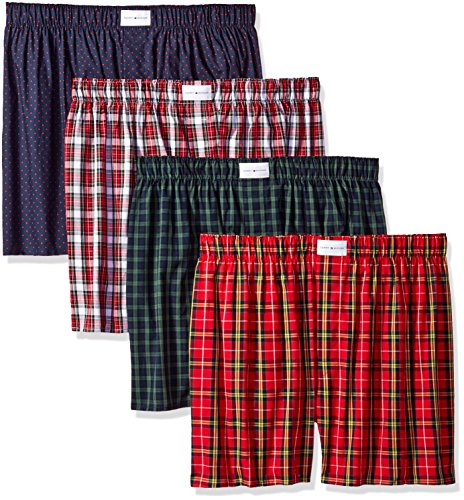Tommy Hilfiger Men's Underwear 4 Pack Cotton Classics Woven Boxers, Red Green Blue, Large