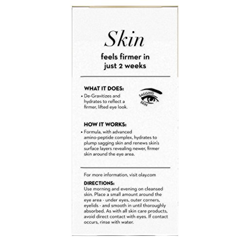 -. Feature : Olay Eyes Eye Lifting Serum Instantly Plumps the Overall Eye Area with Hydration and Reduces the Appearance of Under Eye Bags / With an Advanced Amino-Peptide and Vitamin Complex, this Eye Serum's Velvety Formula Aids in Surface Skin Turnover and Hydrates to Visibly Lift and Smooth Corners Revealing Firmer Skin Around the Eye Area / Degravitizes Sagging Skin on Eyelids and Around the Eyes to Reflect a Firmer, Lifted-Eye allowing YOU to Retire your Tired Eyes and Boost your Outlook / Fragrance-Free Formula is Non-Greasy, so it Quickly Absorbs into the Surface of the Skin / Use Morning and Evening on Cleansed Skin. Place a Small Amount Around the Eye Area - Under Eyes, Outer Corners, Eyelids - and Smooth in until thoroughly Absorbed