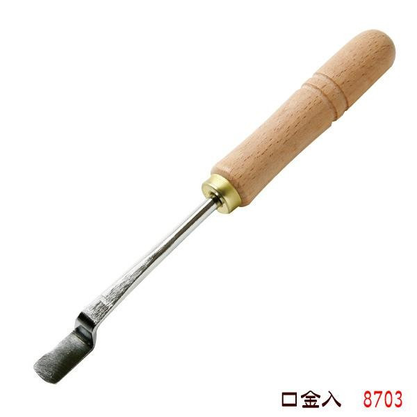 溝に接着剤を均一に塗り、縫い合わせた革、紙ひもを口金入の先端で順に押し込みます。