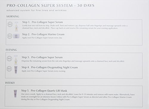 Clinically proven pro-collagen super serum is combined with pro-collagen marine cream, pro-collagen oxygenating night cream and pro-collagen quartz lift mask to deliver a complete at home treatment system for dramatic results against fine lines and wrinkles. 76 percent of woman agreed that the pro-collagen super serum worked faster and better than any other anti-aging wrinkle product they had used in just 14 days. Reduces the appearance of fine lines and wrinkles skin plumping and smoothing effect on the skin clinically proven fast results instant and lasting skin hydration.