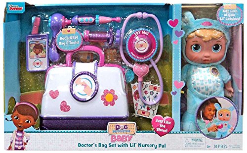 Doc McStuffin's Bag Set includes 9 glittery and sparkly Pieces and Lil' Nursery Pal Doll