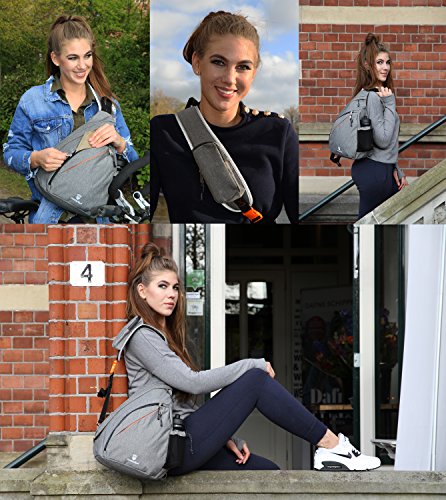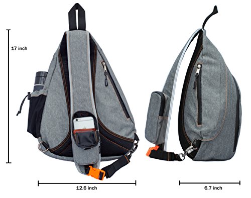 -. Feature : GIVE YOUR BELONGINGS OPTIMUM PROTECTION - Top quality materials and smart designed pockets make sure you don't have to worry about your belongings during your trips. This travel gem keeps your stuff dry. The sturdy 100% waterproof fabric and zippers make this bag water resistant! Perfect for everyday use, day trips, hiking, camping, cycling, outdoor activities, fitness, baby diaper backpack, motorcycle backpack, city backpack, shopping and festivals / TRAVEL IN FREEDOM AND COMFORT...- by carrying the stuff you need in this perfect small size and lightweight crossbody backpack. Compact and very versatile. Please check the size before you buy, this is a small but versatile sling bag with outer dimensions of 17*12.6*6.7 inch, used to carry some daily essentials. It holds an iPad, camera or small laptop up to 12 inch. Funny detail is the "glow in the dark" logo, easy when you look for your bag in the dark / SAFETY FIRST - Stay safe: this daypack is designed to be seen by others. The edges of the shoulder strap and de the zipper pullers are all equipped with reflecting material, which makes you visible in the dark from all angles. Zippers zip-up securely and hold up. You might experience the zippers work a little stiffer because they are waterproof zippers with small teeth and sometimes you need to use a little force to operate it. / GUARANTEED SATISFACTION - In case you're still wondering which sling bag you want to buy of the many sold on Amazon then we can make it easy for you. We want you to be extremely happy with your purchase, so if you don't like it you just return it and you'll get your money back, no questions asked. Our friendly customer service will do anything to help you if necessary. Buy now, you won't regret it! / ENJOY YOUR TRIP TO THE FULLEST - Say hello to comfort and save time for what's really important! The crossbody soft padded breathable and adjustable shoulder strap lets you grab things in the blink of an eye. Five pockets in total to keep you organized: three on the front, an anti-theft pocket invisible for pickpockets and a spacious phone pouch (size 6.3 x 2.7 x 1.2 inch) that holds an iPhone 6 or glasses. There's an external water bottle holder with adjustable strap on the side of the rucksack