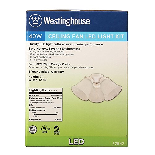 3 light, white, frosted ribbed glass ceiling Fan light kit, indoor use, installs easily with most standard 42" to 52" ceiling fans with a center hole in the housing cap, uses three 5W medium base Omni a15 non-dimmable LED light bulbs, included, 7"H x 12-3/4"W.Feature