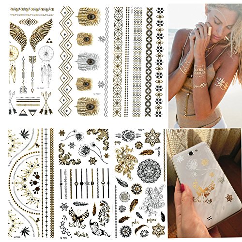Premium Metallic Tattoos- 6 Sheets Temporary Tattoos for Girls 100+ Fake Tattoos, Beautiful Stickers for Body and Cellphones