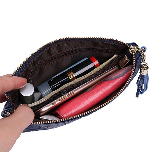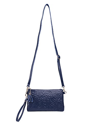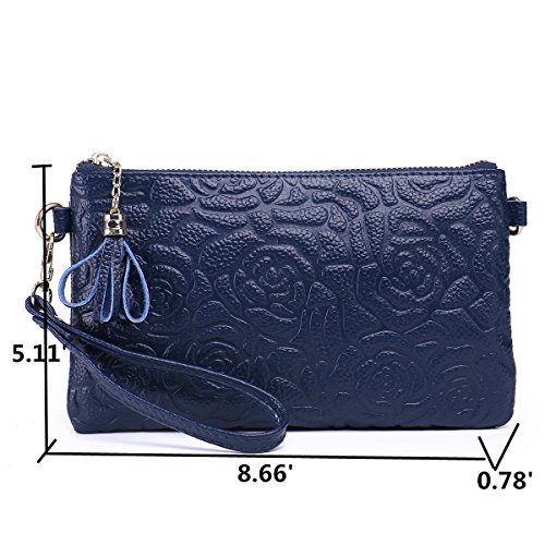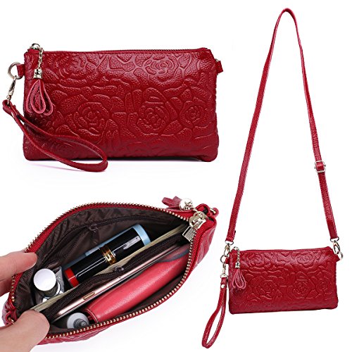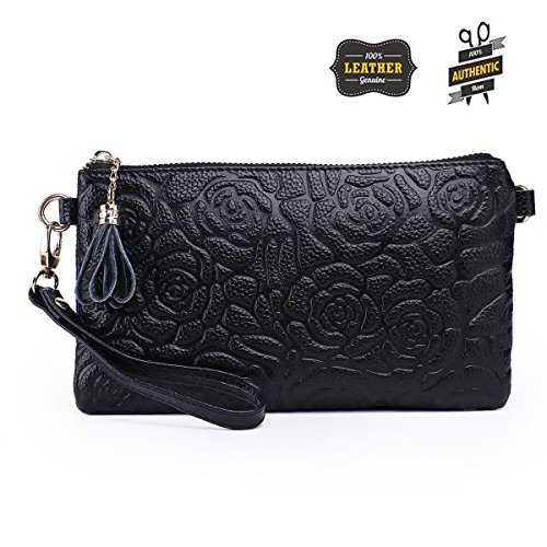 -. Feature : MATERIAL -- Rose Embossing 100% geniune soft leather as exterior, elegant and beautiful. Polyester lining, Exquisite leather Tassel. Luxurious & Stylish & Durable / COMPATIBLE: Fits most Smartphone, including: IPhone 7/7 plus/6/6 plus/6S/5/5S/5C/4/4S, Samsung Note 5/4, Galaxy S8/S8 edge/S7/S7 edge/S6/S6 edge/S5/S4/S3, LG G2, HTC ONE M9, HTC 626S, MOTRO, LG Google Nexus 5, LG G2, HTC One M7, Sony Xperia Z, Moto X, Moto G, Droid Raz. / VERSATILELY -- the dual straps that convert the wristlet clutch to a crossbody bag. A nice product to replace a heavy purse and free your hands when you are shopping,walking dog or travelling. / Store your daily essentials like phone, bills, cards, lips, keys, etc. It fit for all iphones and other smartphones. / STRUCTURE -- Main zipper pockets with 2 hidden pockets, 1 extra zip pocket on the back. 1 detachable and adjustable crossbody strap and 1 detachable wrist strap.