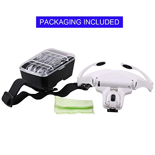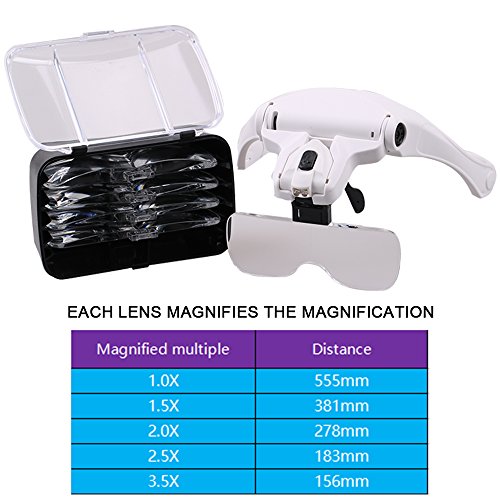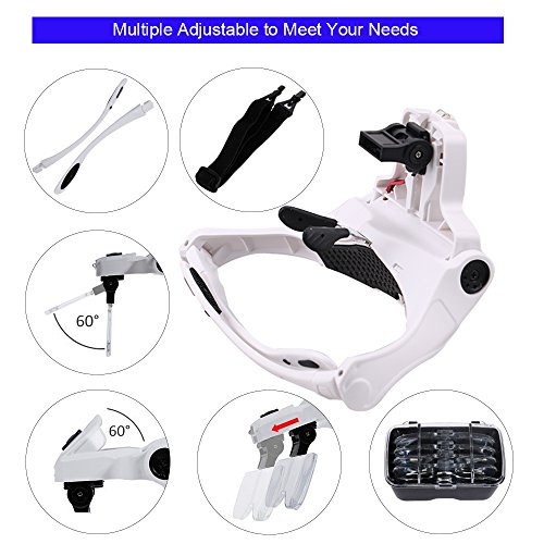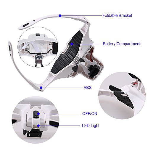 BMBZON Headband Magnifier LED Head Magnifing Glasses Bracket 5 Replaceable Lenses for Reading,Jewelry Loupe(1.0X, 1.5X, 2.0X, 2.5X, 3.5X) (Headband Magnifier)