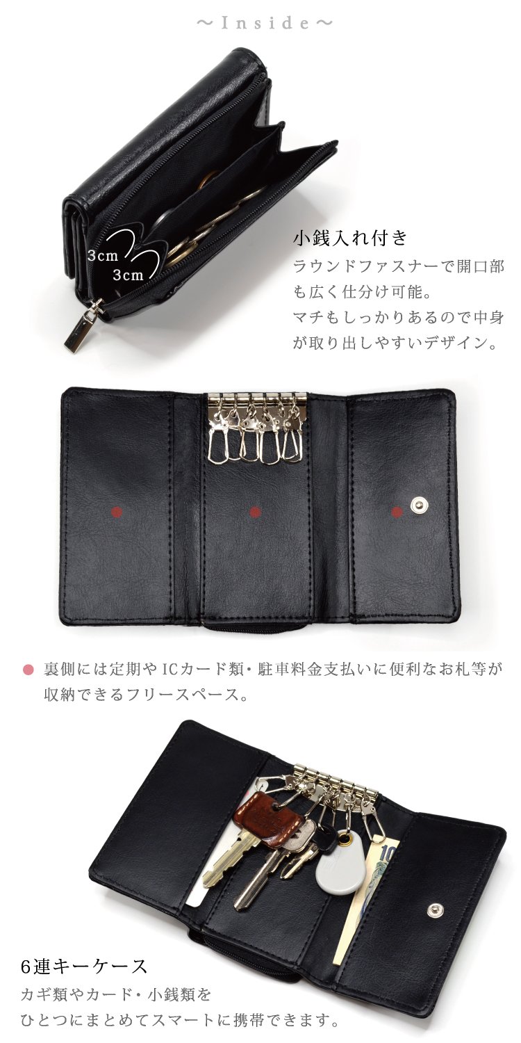 A key case with a round fastener and wide opening, with coin purse that can be sorted.