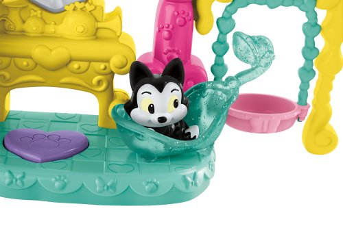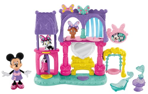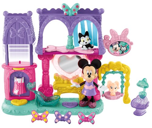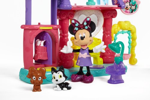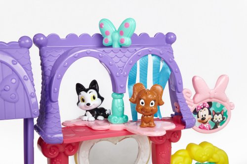 Minnie’s pets are really friendly and well-behaved, so they deserve a little pampering. Of course, a day at the salon with Minnie is sure to offer plenty of fun surprises. At the Pampering Pets Salon, Minnie can wash and dry her pets, play dress-up, sing a song, and make sure her little companions look pretty and precious!Minnie wants her pets to feel great and look spectacular, so the top of the playset features a pet-wash, where your child will love turning the bow to rotate Minnie’s adorable animals on the platform below. A pop-up rooftop also provides additional space for Minnie to show off her beautifully pampered pets. And since Minnie has such fabulous outfits, she needs a special closet – that’s why this very unique salon features a very unique two-sided revolving closet.