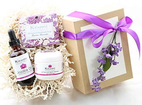 -. Feature : Luxury Gift Set Includes: Handmade Artisan Soap Bar, All Natural Hand Cream, Organic Jojoba Oil / Bring Her Joy with the Perfect Gift Set for Any Occasion! Birthdays, Mother's Day, Showers, Friendship / Full Size Items All Handmade in the USA Using Only All Natural and Organic Ingredients / Each Item of this Truly Superior Gift Set Comes Tucked Snugly into an Attractive Natural Colored Box Nestled with Light Colored Accordion Shred. Box Lid is Covered with a Classy Ivory Embossed Card, Tied with a Colored Satin Ribbon and Topped with a Lovely Decorative Floral Embellishment / Keomi Offers the Absolute Best Customer Service in the Industry. If For Any Reason She is not Thrilled, Receive 100% Money Back Refund