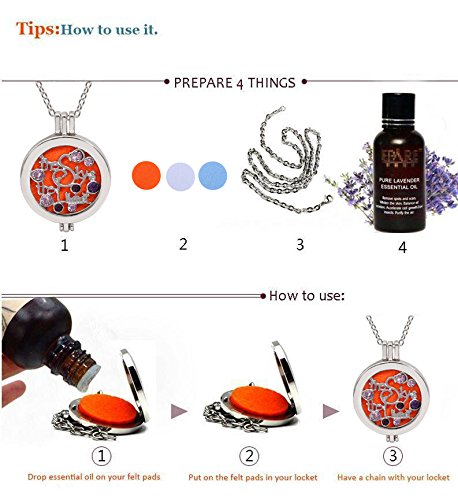 Open the locket and place the pad into the circle of the pendant, then add your favourite fragrance into the pad 1 to 3 drops. After a few seconds pad will absorb the oil and you may enjoy your day with your beautiful smell.
