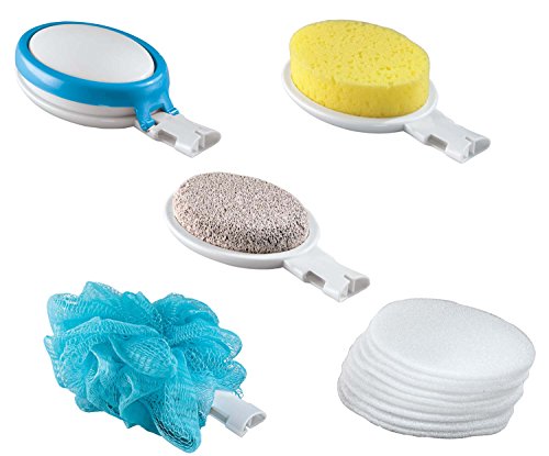Long handled bath brush with easy-reach 19" folding handle has four interchangeable heads: sponge, pumice, loofah, and lotion applicator. Non-slip ergonomic grip. 15 piece interchangeable bath sponges with handle includes 10 lotion application pads and a zip storage case.Feature