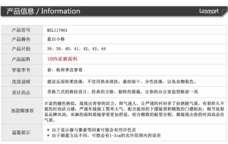 产品名称:LESMART秋装 亚麻格纹男式衬衫 2013 新品 长袖衬衣 男 蓝白格纹