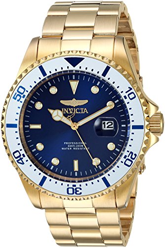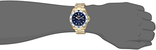 Invicta 23382 Pro Diver men's dive watch features a 43mm wide and 12mm thick yellow gold plated solid stainless steel case with a unidirectional rotating white accented gold tone bezel and textured screw down crown. Invicta 23382 is powered by Japanese TMI PC32A quartz movement. This stylish watch also features a shiny sunray blue dial with light green accents gold tone luminous hands and dot hour markers along with the date display function, scratch resistant flame fusion crystal and water resistant to 200 meters. Invicta 23382 is equipped with a 22mm wide yellow gold plated solid stainless steel bracelet with a fold over safety lock clasp. Invicta 23382 men's Pro Diver blue dial yellow gold steel bracelet dive watch is brand new and comes in an original Invicta gift box and is backed by a 5 year limited warranty.Feature