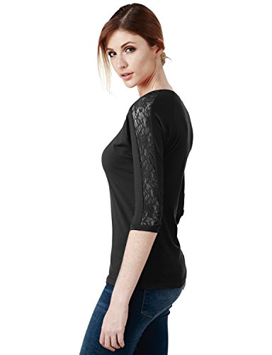 -. Binding : Apparel -. Brand : Elbon Boutique -. Department : womens -. Feature : Machine Wash Cold / Hang Dry / 3/4 Sleeve V-Neck Lace Paneled Top / #AWTTS0178 - 3/4 Sleeve Round Neck Top With Lace Trim Sleeves / Features Henley Neckline, Bodycon Fit, 3/4 Sleeves, And Lace Trim / Soft And Comfortable Fit / Please be advised to see our size chart for the most accurate fit. -. Model : BXUUT1289 -. ProductGroup : Apparel -. ProductTypeName : SHIRT -. Title : Elbon Boutique Women Trendy Round Neckline Lace Design Short Sleeve Top
