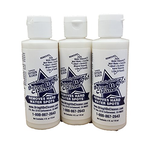 -. Binding : Health and Beauty -. Brand : Bring It On Cleaner -. EAN : 0650415172887 -. Feature : SAFE NON-TOXIC POWERFUL OXYGEN BLEACH and fine jewellers grade abrasives effectively eliminate hard water stains and soap scum from your shower door glass and window / REMOVE STAINS from grout tiles sinks and tubs including fiberglass and makes them shine like new again / REMOVE CALCIUM MINERAL AND RUST STAINS from brick stone concrete chrome and metal. Suitable for use with drill brushes sold separately / CLEANS SOOTY FIREPLACE GLASS stove top glass and enamel / SAFE AROUND KIDS AND PETS completely non toxic oxygen bleach contains no chlorine or harmful chemicals. Fresh mint scent. Safe for the environment -. Label : Bring It On Cleaner -. Manufacturer : Bring It On Cleaner -. ProductGroup : Health and Beauty -. ProductTypeName : HEALTH_PERSONAL_CARE -. Publisher : Bring It On Cleaner -. Studio : Bring It On Cleaner -. Title : Bring It On Cleaner: Shower Door Hard Water Spot Stain Remover 4 Ounce x 3 with OXYGEN BLEACH. Safely Clean Shower Door Glass, Tiles, Taps, Grout and Fiberglas 4oz -. UPC : 650415172887