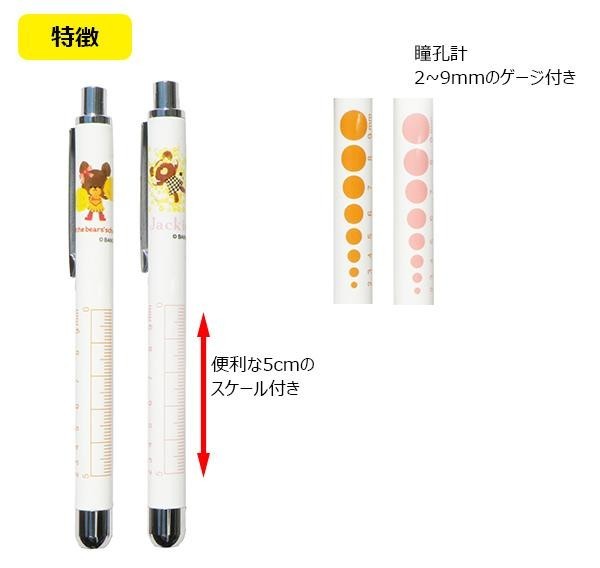 大人気の「くまのがっこう」のジャッキーがペンライトになって登場です。ナースの現場で使用されているソフトLEDライトを採用。使いやすいノック式で、胸ポケットに挿せるクリップが付いています。 |