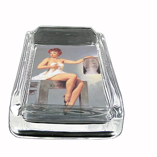 -. Title : Glass Square Ashtray Pin Up Redhead Girl Chest X-Ray Whiskey D-066