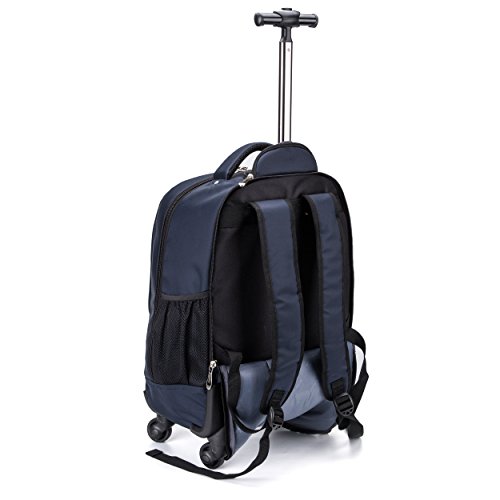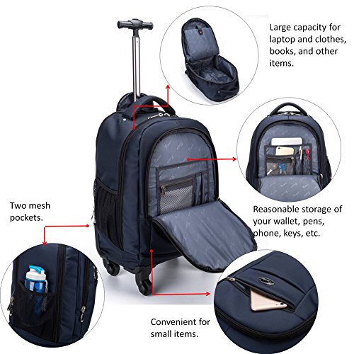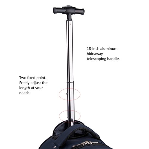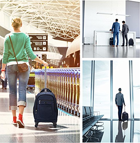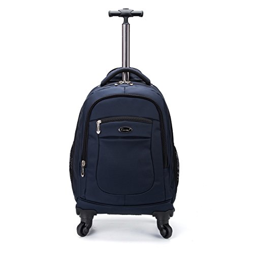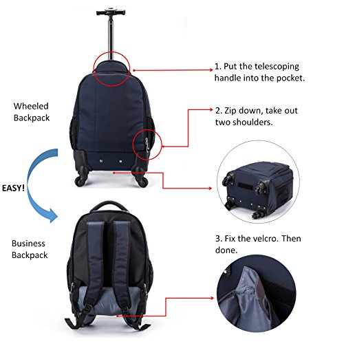 Studio : Racini Publisher : Racini Product Description Note: The wheeled rolling backpack taken in the pictures is filled with goods while the backpack you receive is with nothing. So it looks smaller when you receive. Do not worry. Just use it to carry your things and it will look the same as pictures. Computer Backpack and Wheeled Travel Bag combine both in one. The shoulder straps are padded and can be tucked away when you need the ease of a wheeled bag. This wheeled rolling backpack is a perfect travel companion when you are hauling a lot of gear. The multi-compartment design keeps all of your items organized. A large separate shockproof compartment is for 16 inch computer and you can also put 17.3 inch laptop with other items in the biggest compartment if you need.